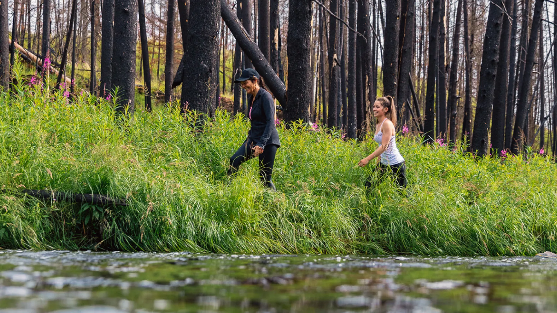 Wilderness trails Explore a wide array of terrain and some incredible scenery in a fragile post-wildfire environment — rocky bluffs, meadows, marshes and woods — as long as you stay on the designated routes in accordance with our land stewardship best practices. Trails include gravel backcountry roads, dirt tracks, double-wide grassy paths and challenging, steep little paths. Bikes of all sizes and helmets are on a rack beside the lodge, so you can hop on and go, anytime, for this self-guided activity. Guests generally enjoy biking, hiking and jogging as an unguided activity once they've got the lay of the land from riding with the wranglers, however, guided biking and hikes are always available upon request. Alpine heli-hiking is one of our favourite activities! | | | |