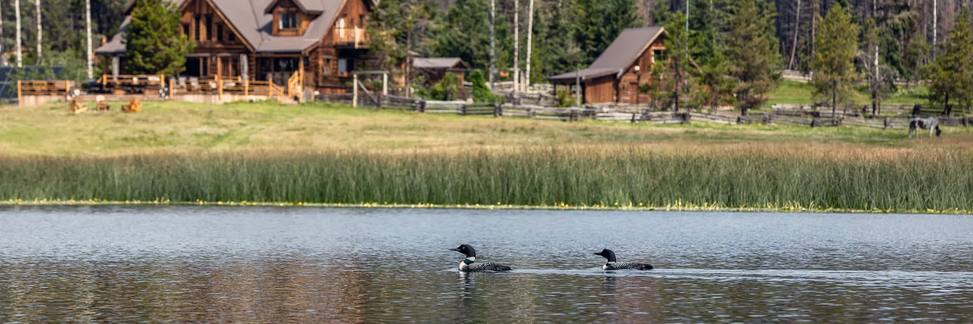Ranch house and barn looking from across the lake